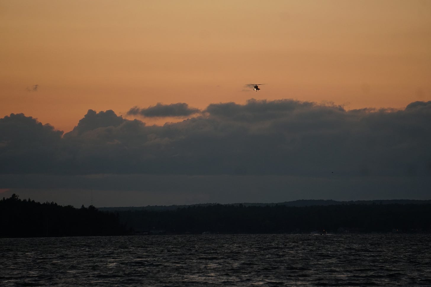I jumped out of my tent just as they flew nearly right overhead and low, with the spotlight sweeping across the water. The familiar orange paint job on the burly fuselage still obvious in the fading light. They made a hard banking turn and headed north west up the channel. In the distance, on the opposite side of the bay was a flashing blue light on the water.